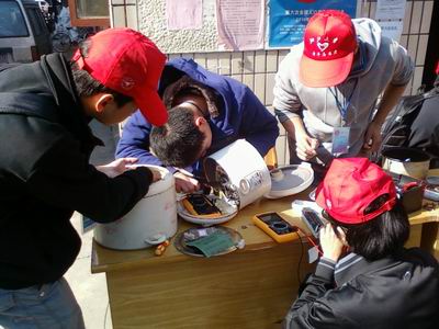 故障的家电大多是电蚊拍、电饭煲或电茶壶之类的小型家电。训练有素的同学们麻利地将其拆卸,并迅速从中发现故障的原因。有些故障可以通过更换常用零件来排除,同学们不遗余力,修好了许多家电;有些故障是因为某些专用的零件损毁,同学们也会耐心地向报修人解释故障原因,并为他们提供最佳的解决方案。由于该社区的居民大多是老年人,部分损坏的电器年代久远,排除此类电器的故障成了一项富有挑战性的任务。面对古旧的收音机和电饭煲,几位核心成员紧锁双眉,时而接通电源,细心调试着电器;时而在线丛中拨拨弄弄,检查着线路的连接。从中午到下午,围观的人越来越多,几位社区居民还热心地提出自己的修理建议,为队员们提供思路。