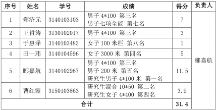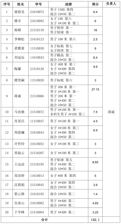 在本次运动会中,电气学子顽强拼搏,创下佳绩!本科生组中,田一玮获得女子3000米第四名,郦嘉航夺得了男子200米第五名,郑济元获得男子七项全能第七名,于惠泽在女子100米栏中获得第八名。在男子4*100米的接力比赛中,电气学院代表更是斩获了季军。研究生组中,蒋威在研究生男子200米、400米中夺冠,杨顺在研究生男子铅球和铁饼中也是勇夺双冠。在4*100米的接力比赛中,电气学院代表在研究生男子组和研究生女子组中分别获得了第一名和第三名的好成绩。另外,在4*400米中,电气学院代表在研究生男子组和女子组中分别获得了第二名和第四名。最终,在总分榜上研究生组获得了团体第三名的佳绩。