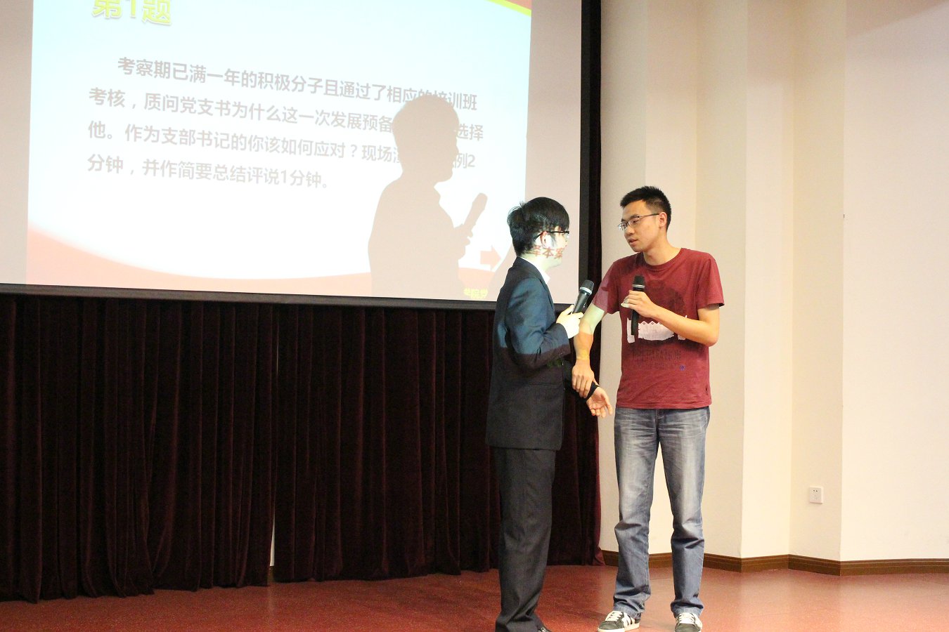 比赛进入情景模拟环节,参赛支部书记根据现场抽取的案例分析题目,和兼职辅导员配合以情景演绎的方式完成。面对“百般刁难”,党支书们通过坦诚细致的沟通将问题一一化解,展示了良好的工作态度、工作能力和工作方法,演绎过程生动展现了基层党支部在工作实践中面临的困难和挑战,党支部书记应有的责任意识和应变能力,妙趣横生的情景模拟将比赛的气氛进一步推向了高潮。