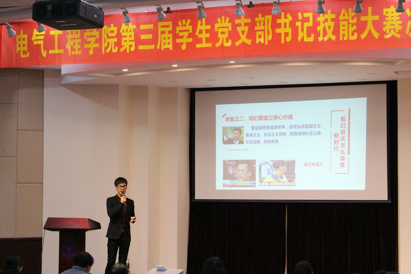 在“微党课”环节,党支书们围绕长征精神、从严治党、党性基因等话题展开热议,既能从大处着眼紧扣时代脉搏,又能从小处入手明确自身职责;六位党支书以清晰的表达、生动的案例为现场评委和观众呈现了精彩纷呈的党课。党务知识测试环节注重考察党支书的党建工作实务,对推优、党员发展过程中的工作规范做了细致的测试,6位选手的表现充分体现了电气学院党支书扎实的党务素养。