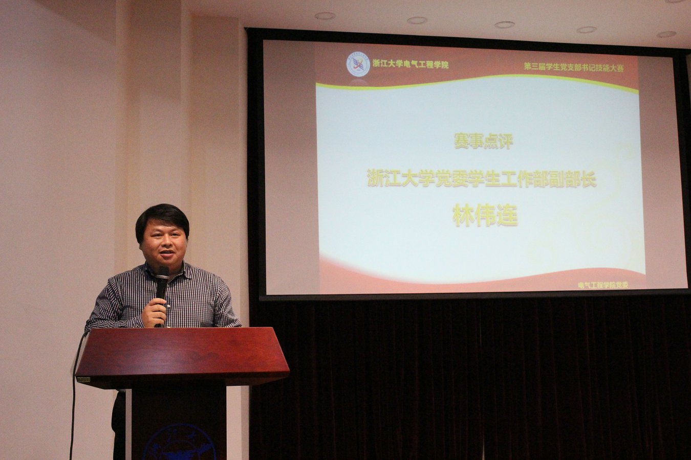 比赛环节结束后,林伟连老师对各位参赛选手的表现作了细致的点评并提出了宝贵的建议。在肯定本次比赛的组织以及党支部书记表现的同时,林伟连老师指出了在党课环节中支部书记应区分演讲和讲课的区别,注意与授课对象的互动;展示形式可以更丰富,增强吸引力以达到更好的教育效果。