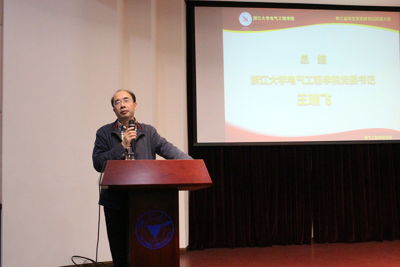 随后,主持人宣布比赛结果。颁奖结束后,王瑞飞老师进行了总结发言。王瑞飞老师肯定了本次党支部书记技能大赛的形式及取得的良好效果,通过历年的党支书技能大赛看到了电气学院学生党员实实在在的成长,强调了学生党支部在高校党建和思想政治教育中的战斗堡垒作用以及党支部书记应发挥的先锋模范作用。最后,他勉励在座学生党建骨干,要抓住机会、锻炼才能,提升综合素质、勇于承担责任,以良好的心态、开放的姿态参与各种有益的学生活动,在科研生活、社会服务等方方面面得到锻炼提高并做出良好表率。