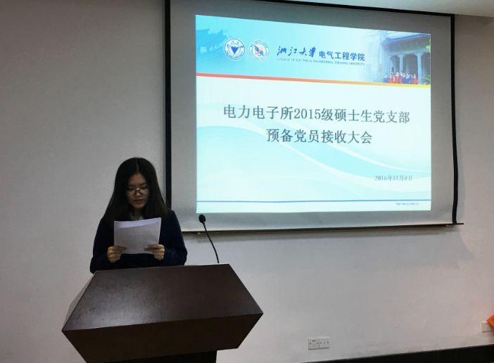 2016年11月8日下午6点30分,寒风凛冽中,24名党员和积极分子带着红彤彤的脸庞进入到第二教学楼121教室,电力电子所2015级硕士生党支部预备党员接收大会及微党课活动由此展开。这次会议由党支书沈莉娟主持,分为两个主旨,一是接收谭园和王腾飞两位积极分子成为预备党员;二是开展班级微党课活动,进行主题展示和心得分享。
