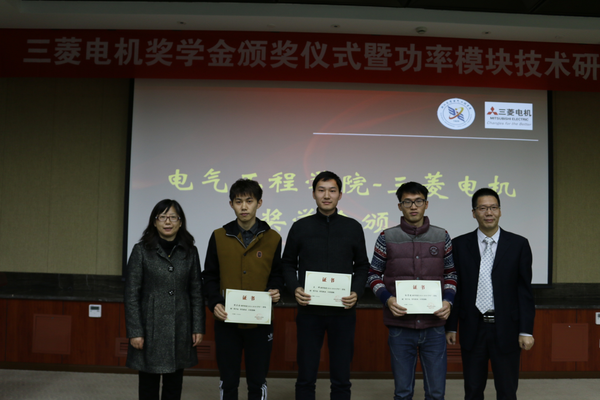 本年度学院共计有4名博士研究生、7名硕士研究生获得了三菱电机奖学金。四个所大亮先生对获奖的学生表示热烈的祝贺。回馈社会、关怀教育是三菱电机一贯的宗旨。他表示,在新的十年开启之际,三菱电机会一如既往地支持电气学院的人才培养事业与中国的电气工程事业,为技术创新、科技进步贡献力量。