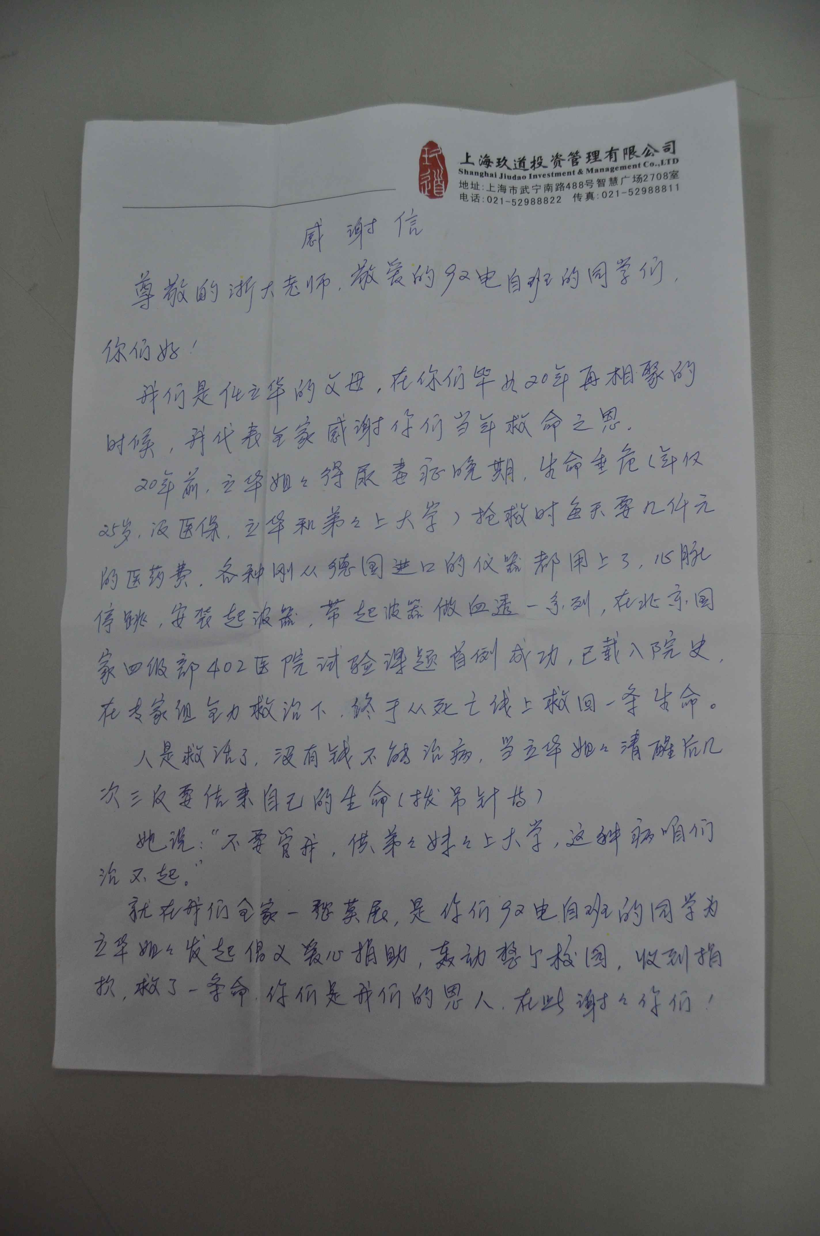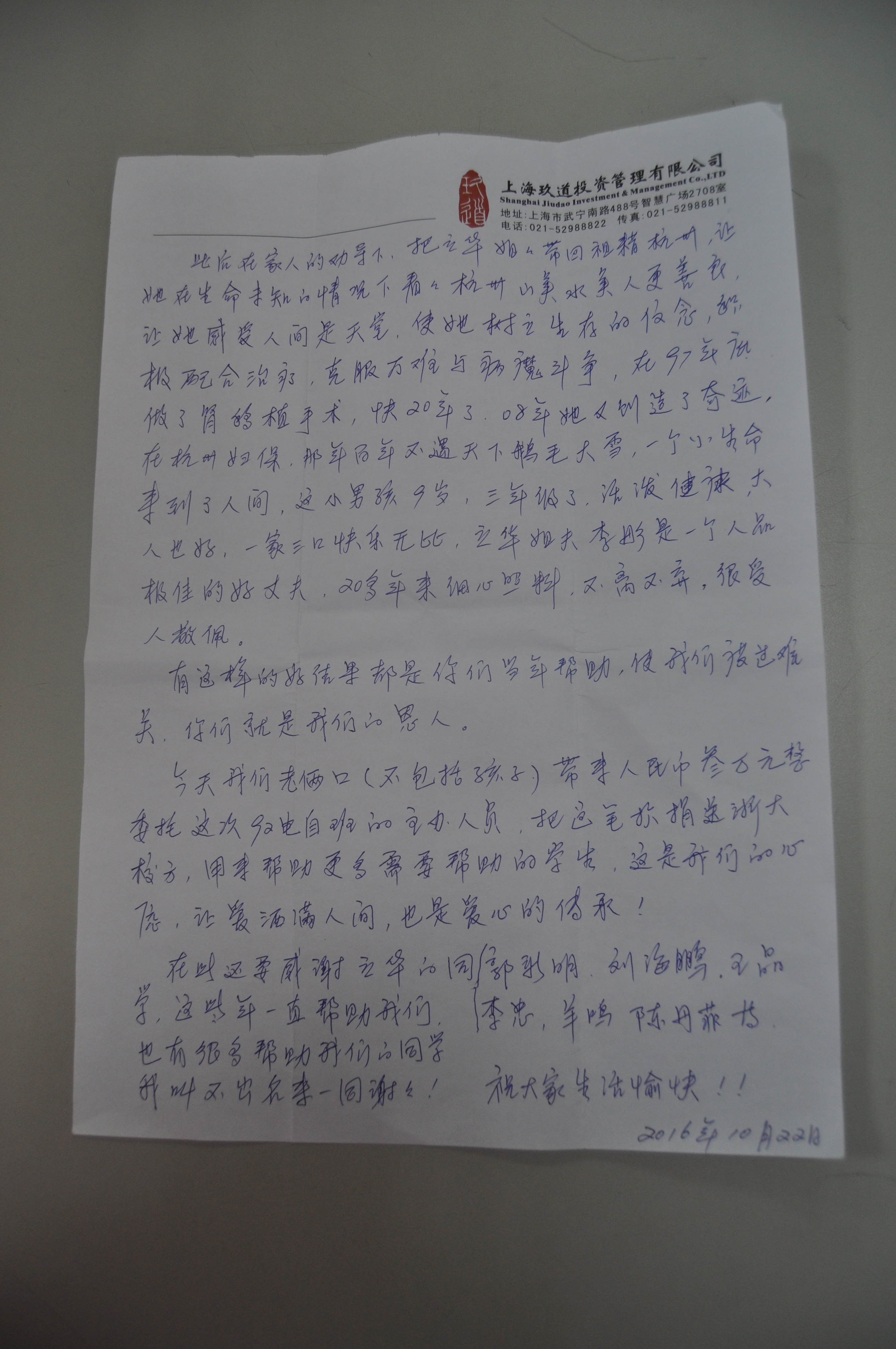 2016年,电自92级校友毕业20周年返校团聚,任立华的父母怀揣着这封饱含深情的感谢信和积攒的三万元现金来到了现场,他们说要把这笔钱捐给bb贝博艾弗森官方网站,捐给有需要的同学,让爱洒满人间,让那些遭受命运无情打击的同学坚信无疆的大爱,坚信生命的力量。参加返校聚会的校友深受感染,当即决定将此次组织聚会剩余的经费9.5万元连同立华父母的捐款一起捐给bb贝博艾弗森官方网站,将爱心传递下去。