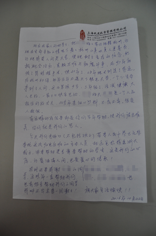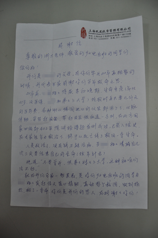 这是一封“迟到”的感谢信,朴实无华的语言,娓娓道来一个关于生命、关于爱的故事。二十年前,我院92级电自班同学XXX的姐姐罹患尿毒症,每天动辄上千元的医疗费用对于本就不宽裕的家庭而言无疑是雪上加霜。XXX校友的姐姐在清醒的时候,甚至想过结束自己的生命,她说:“不要管我,供弟弟妹妹上大学,这种病咱们治不起”。在全家为高昂的费用一筹莫展之际,92级电自班的同学雪中送炭,发起了爱心捐助倡议。一时间,爱的暖流汇聚求是园,老师同学们纷纷慷慨解囊,筹集了捐款近三万元。多年来,同学们与XXX校友的家中保持了密切的联系,在困难中伸出援手,在绝望中带去希望,不仅在经济上继续帮助姐姐,更在精神上激励她勇敢地走下去,汇聚涓细的温暖,融化心灵的坚冰。